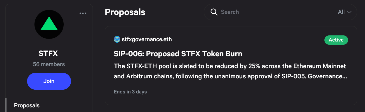 **Governance proposals and discussions are available in the official forum on**[ **https://gov.stfx.io**](https://gov.stfx.io)&#x20;